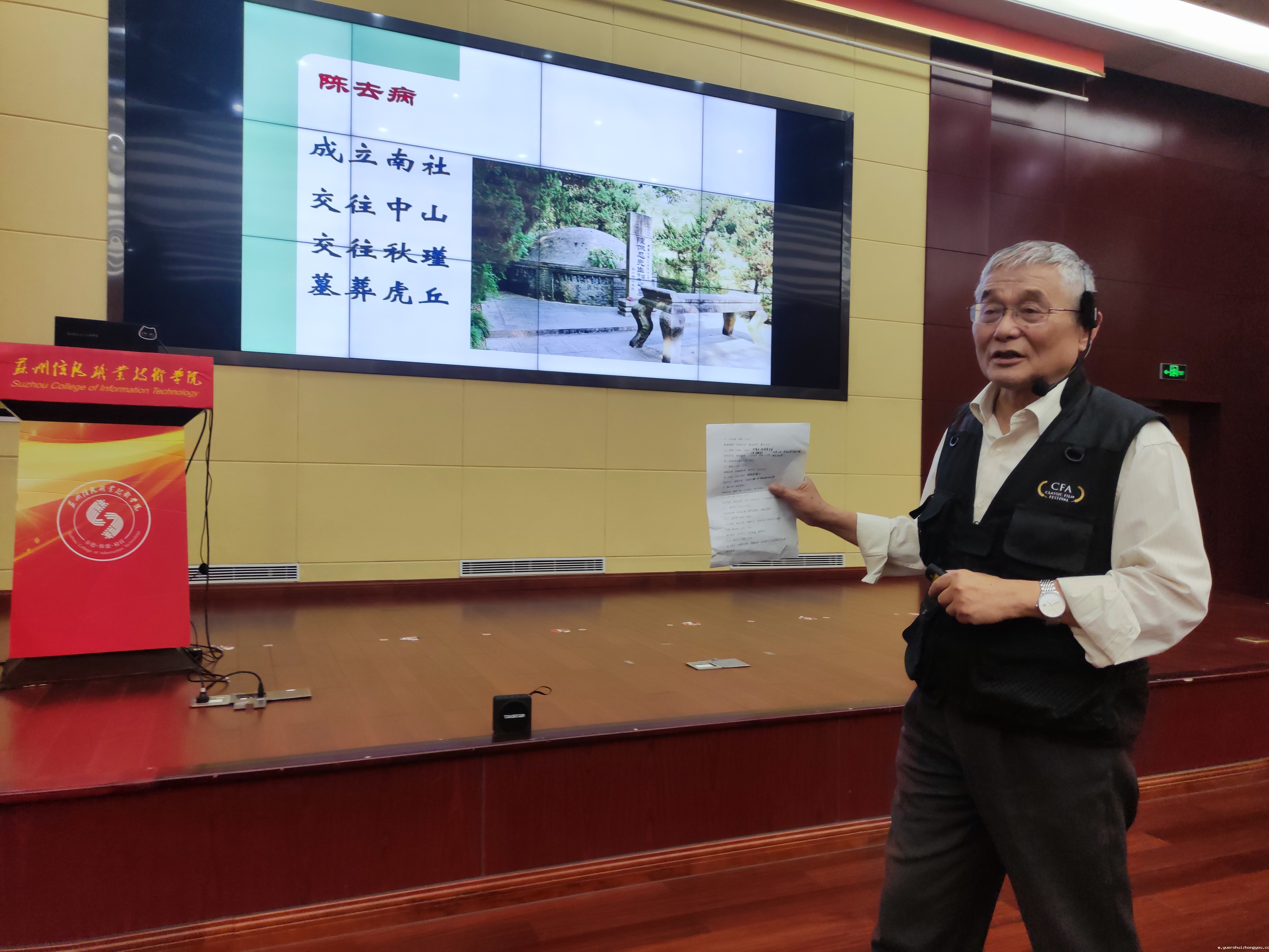 王教授在名人故事中还穿插了我国古代嫡长子继承制、科举制度、苏州状元概况等文化常识,同时将自己多年来拍摄的山塘夜景、高义园、唐寅墓、苏州织造署、葫芦庙等经典照片一一呈现于师生面前,他鼓励大家走出校园,寻访古迹,增长见识。